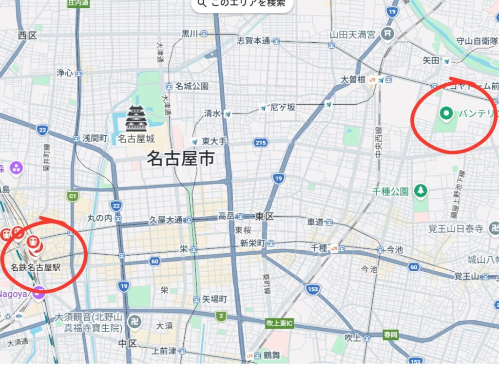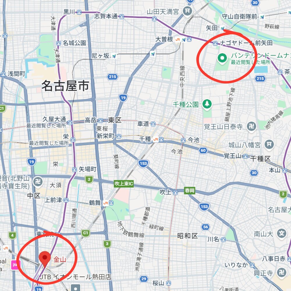 金山駅は、バンテリンドームの最寄り駅・ナゴヤドーム前矢田駅から地下鉄名城線で約25分ほど。