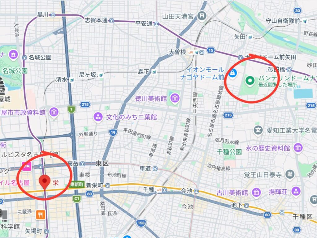 栄駅は、バンテリンドームの最寄り駅・ナゴヤドーム前矢田駅から地下鉄名城線で約16分ほど。