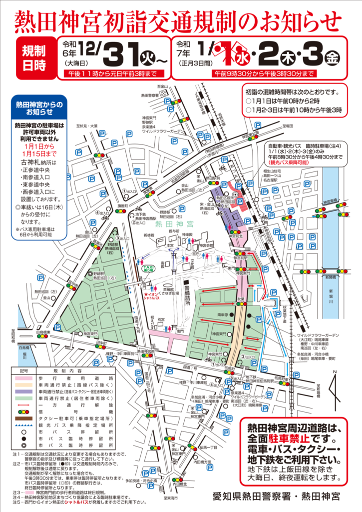熱田神宮の公式駐車場(東門、南門、西門の3箇所、合計約400台)は、12月31日夜から1月5日まで閉鎖されます。